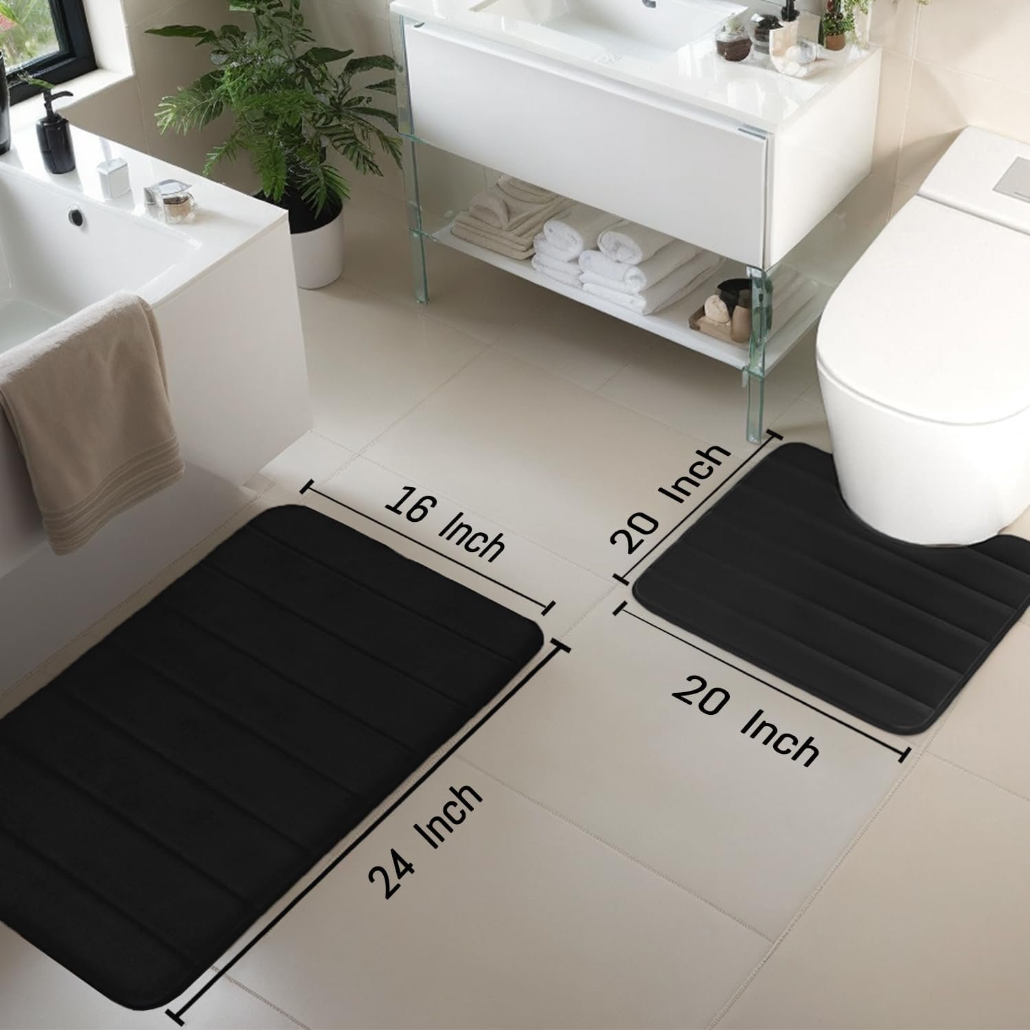Bathroom Rugs Set Memory Foam Bath Rugs Non-Slip Bath Mat Set 3 Piece,Washable Bathroom Mats,orbent Shaggy Rugs Super Soft U-Shaped Toilet Rug,Bahroom Carpets for Bathroom,Tub,Shower(Black)